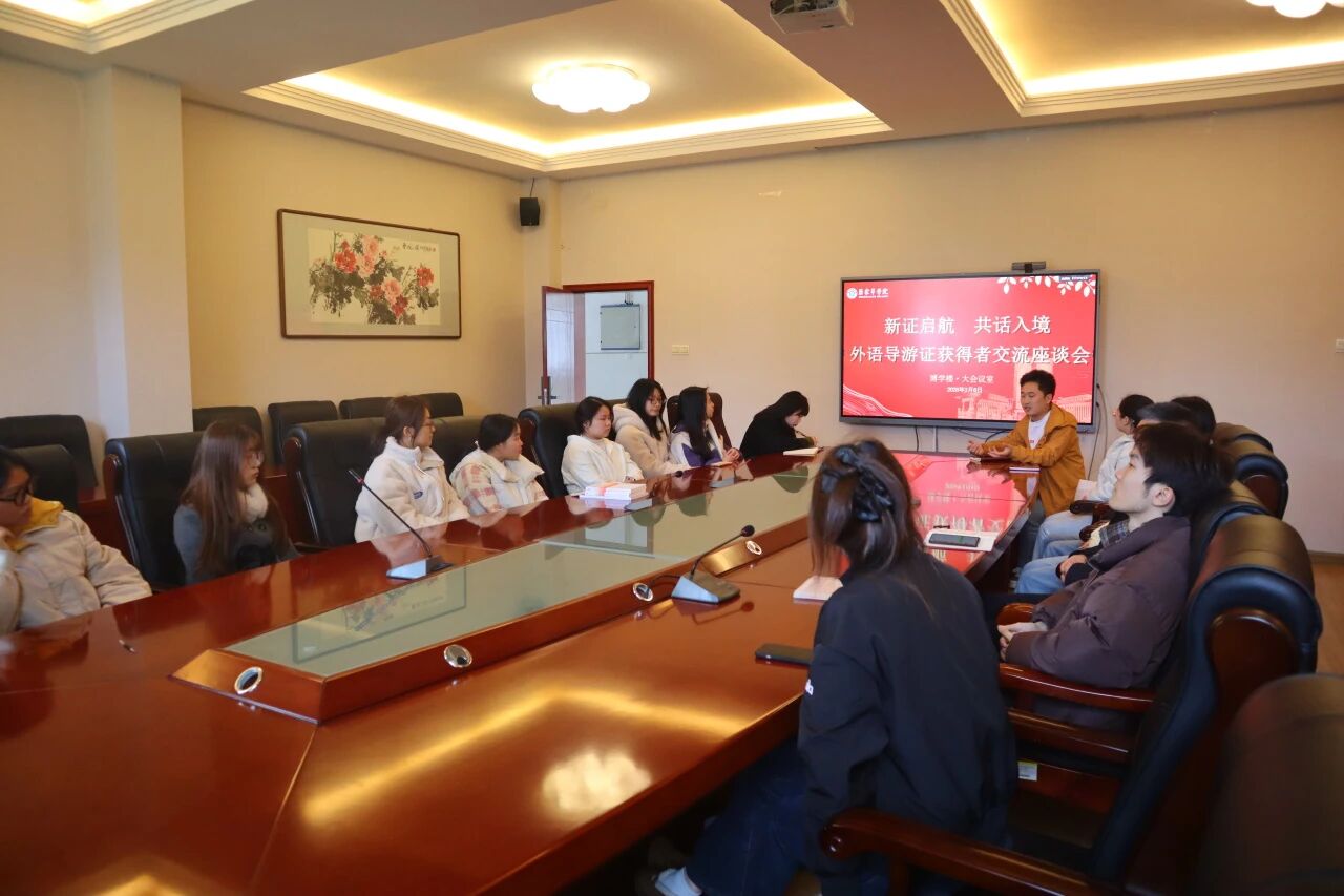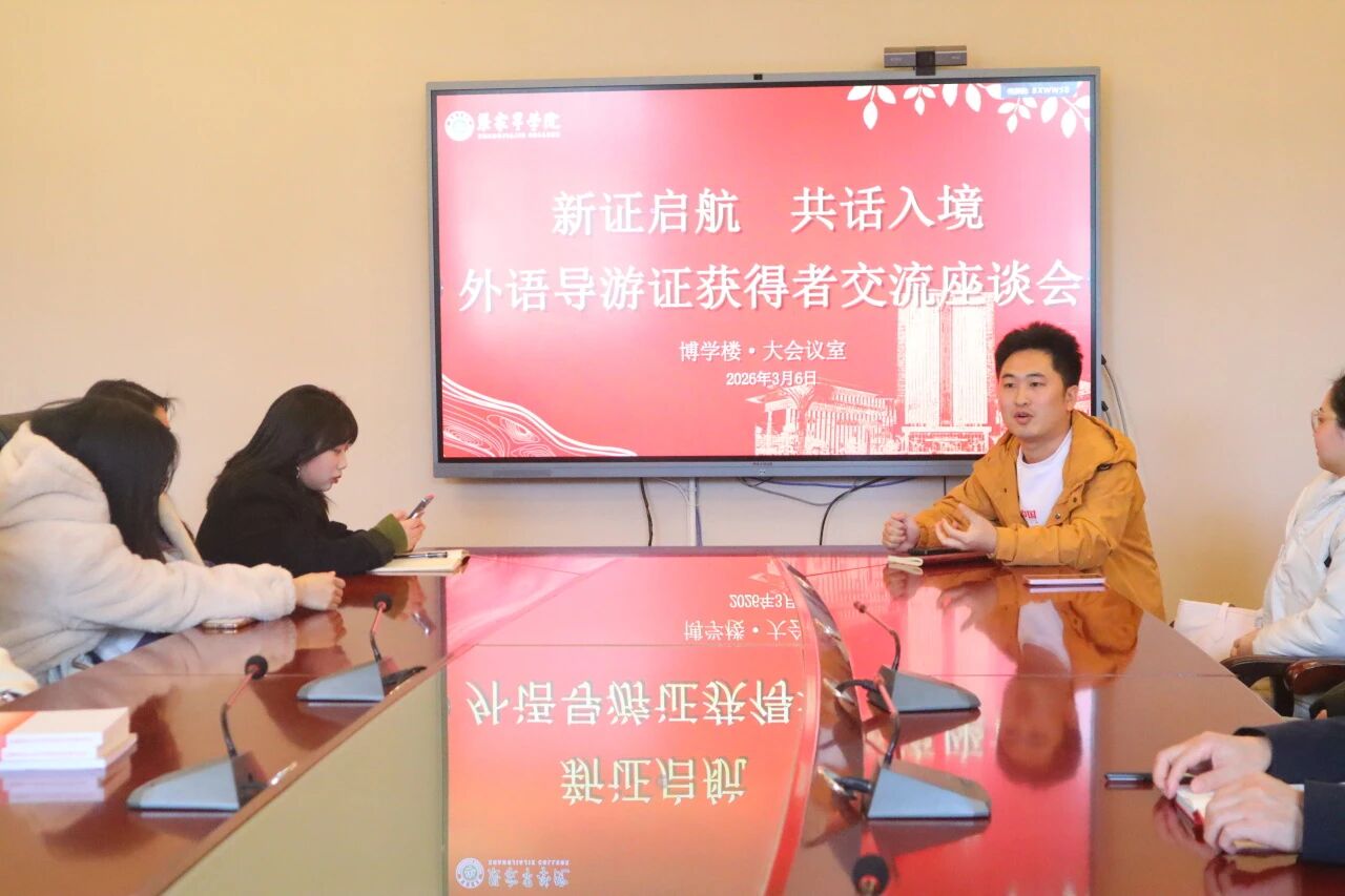 3月6日下午,我院在博学楼三楼会议室召开外语导游证获得者交流座谈会。院长汤敬安、就业专干雷诗翌、张家界国旅国际旅行社代表及外语导游证获得者学生代表参加会议,团总支副书记张宇主持。