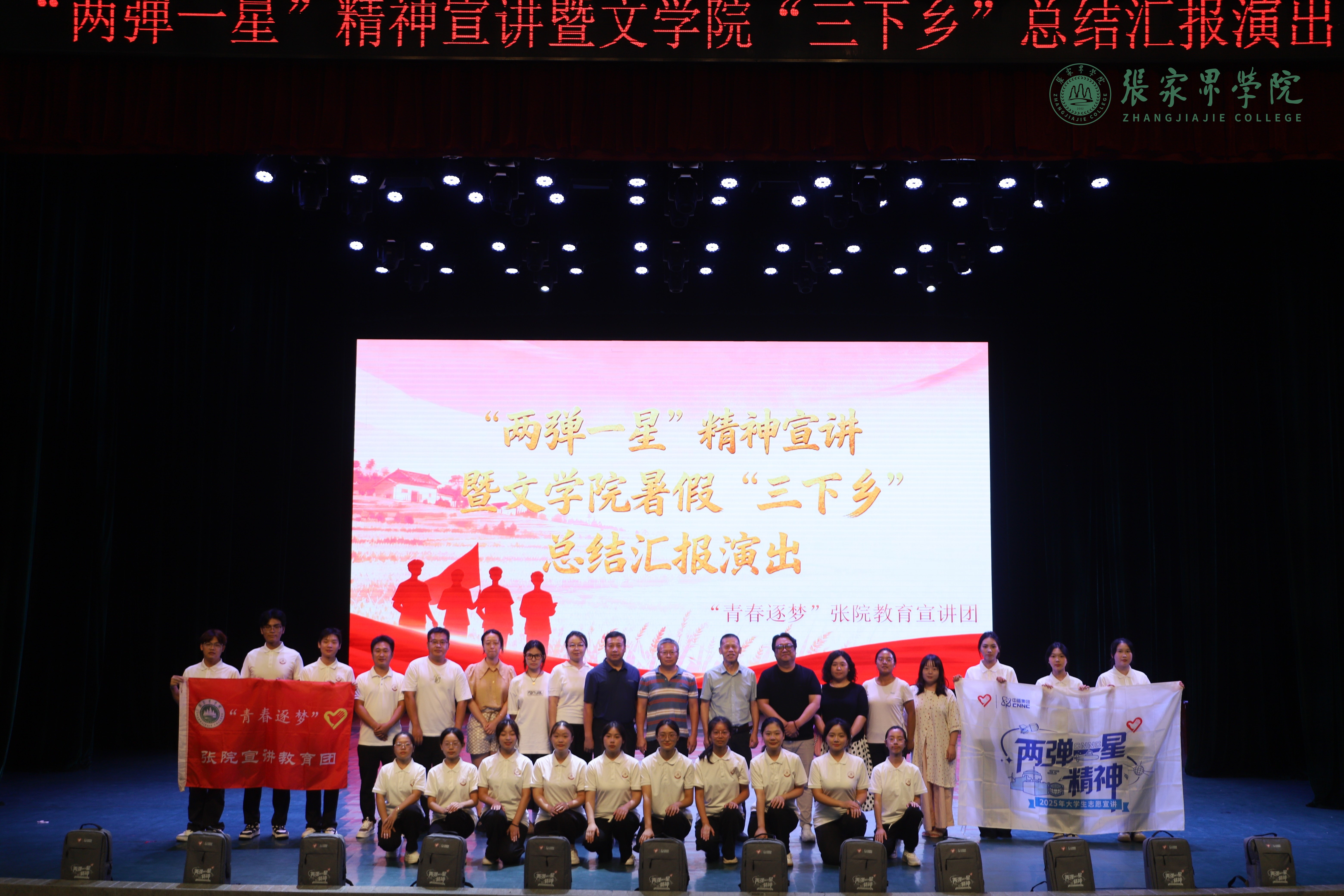 2025-10-1110月10日,"两弹一星"精神宣讲暨文学院"三下乡"社会实践活动成果汇演在风雅厅举办,学校各学院团总支学生会干部与文学院全体新生参与。